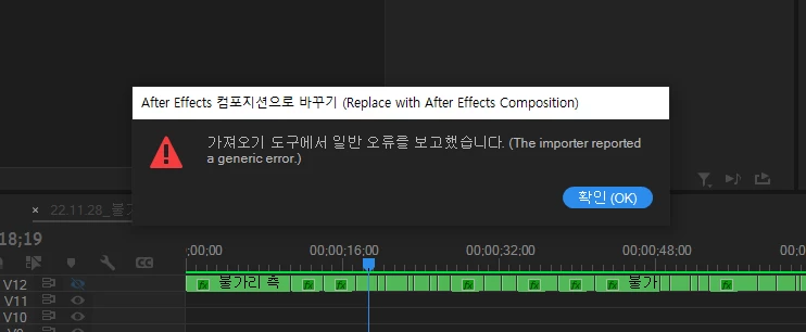 프리미어 프로에서 에펙으로 보내려는데 오류가 나옵니다