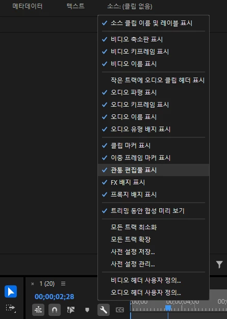 한번 타임라인 옆 스패너 표시 설정을 눌러 한번 타임라인에 표시되는 옵션을 확인해서 지금 확인되는 효과 설정 표시가 되지않도록 설정해 보세요.