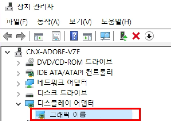 왼쪽하단 시작메뉴 우클릭 > 장치 관리자 > 디스플레이 어댑터 > 그래픽이름을 알려주세요