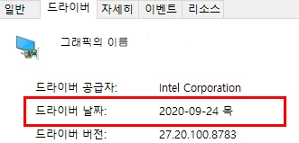 장치 관리자 > 디스플레이 어댑터 > 그래픽이름 우클릭 > 속성 > 드라이버 > 드라이버 날짜