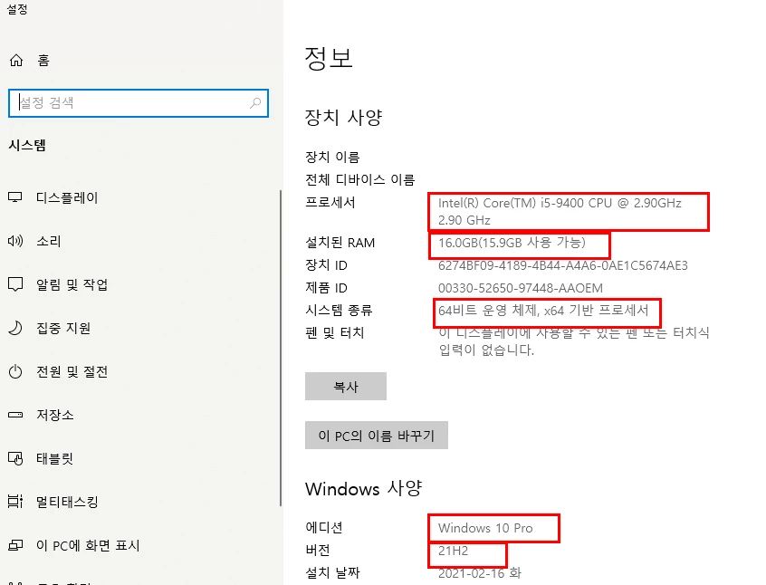 2. 사양문제 (윈도우 사양확인방법)