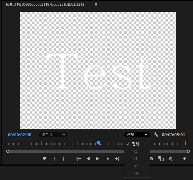 해당 프리뷰의 미리보기 화질을 1/2또는 1/4등으로 변경할 수 있으며 이것은 내보내기 화질과는 관련이 없이 단순 작업시 미리보기 화질만 변경되며 작업중인 영상의 고화질 유무에 따라 설정할 수 있는 화질 옵션이 차이가 날 수있습니다.