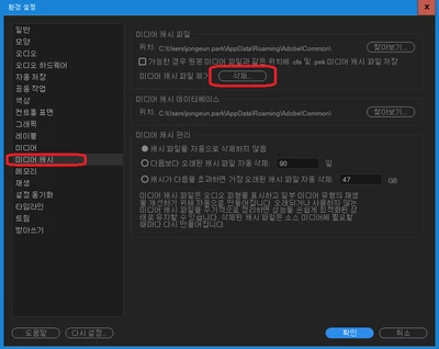 편집 > 환경설정 > 미디어 캐시 > 미디어 캐시 파일 삭제 클릭 > 확인 클릭해주세요