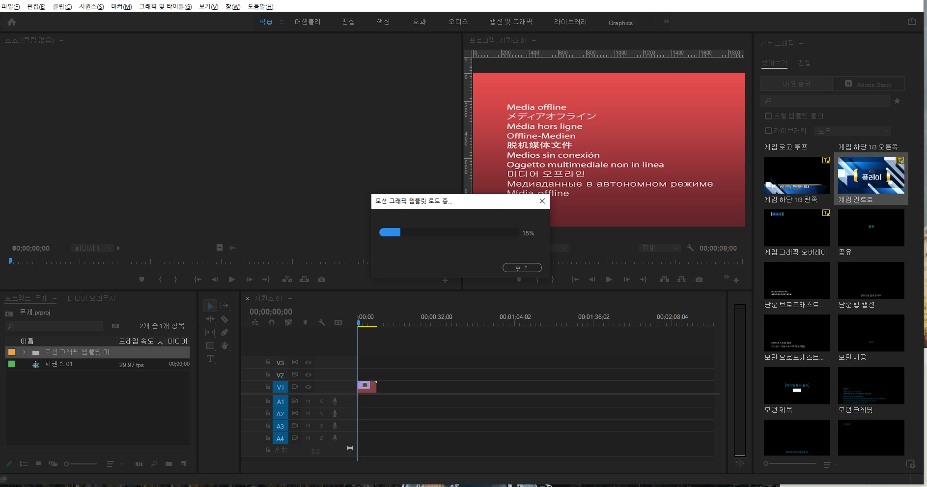 시퀀스로 자막 템플릿(mogart)을 불러올 때 다음과 같은 오류가 뜨면서 15% 이상 로드가 진행되지 않고 멈춰버리네요.