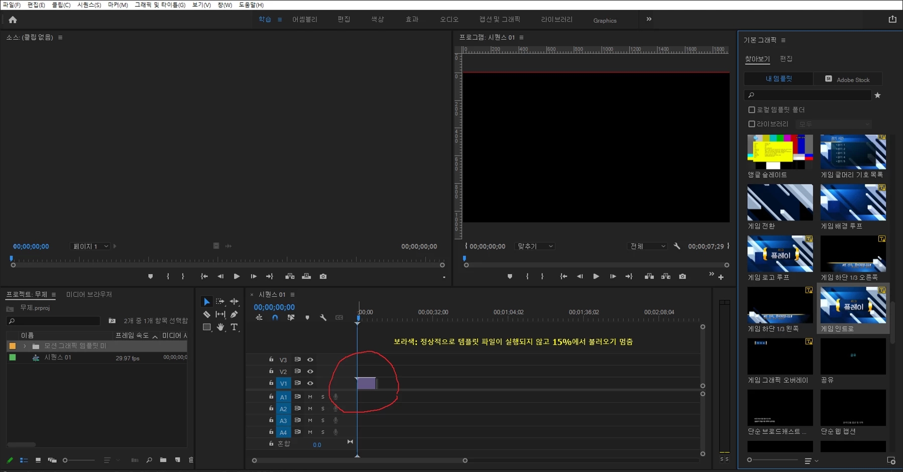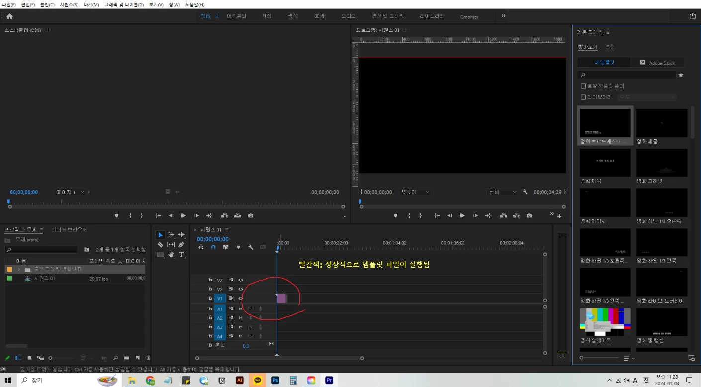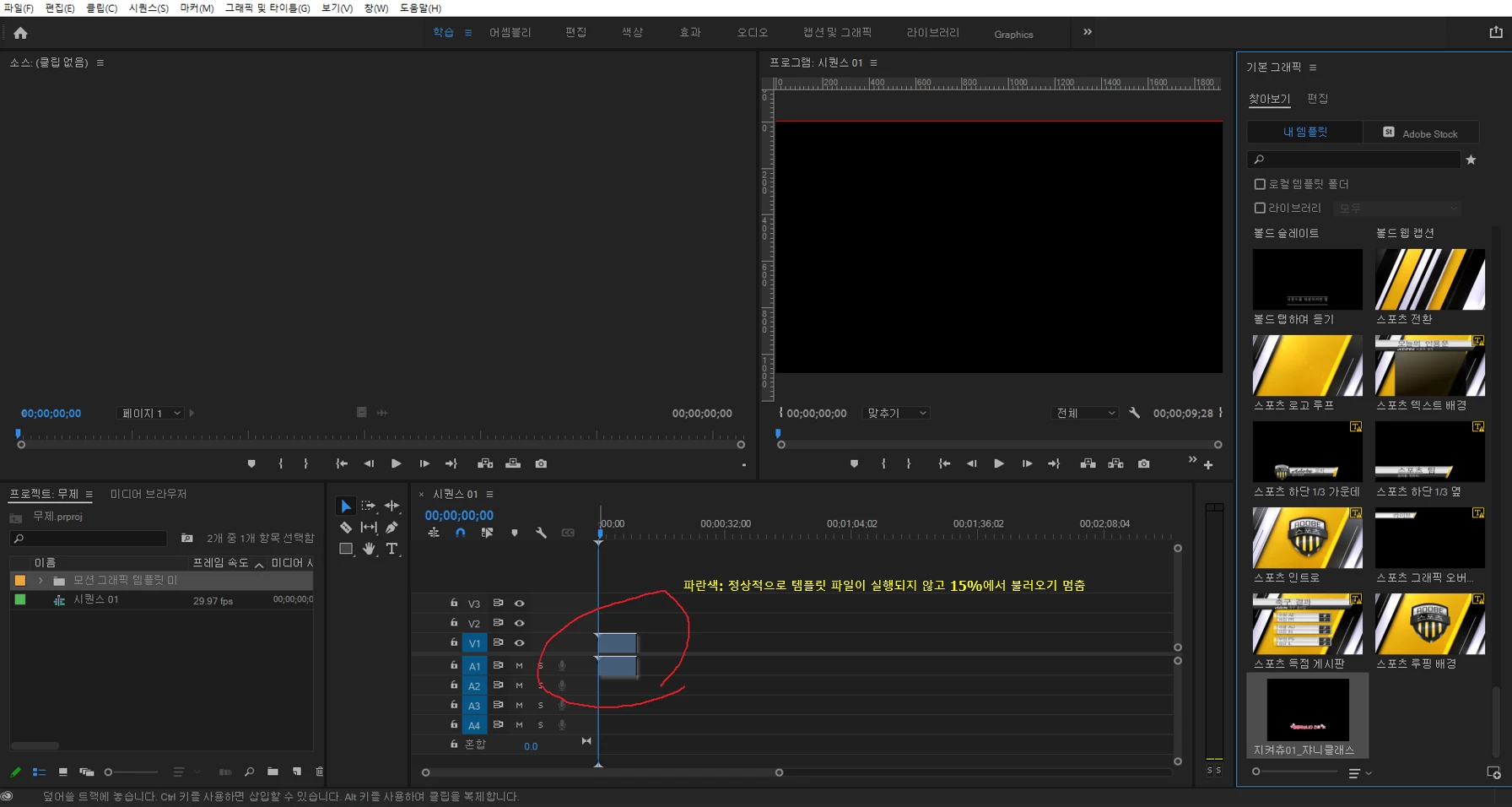외부에서 불러온 템플릿이나 아니면 기존에 프리미어에서 기본적으로 제공하는 템플릿인지는 관계없이 빨간색은 정상적으로 템플릿 불러오기가 되고 파란색과 보라색이 문제가 발생합니다.