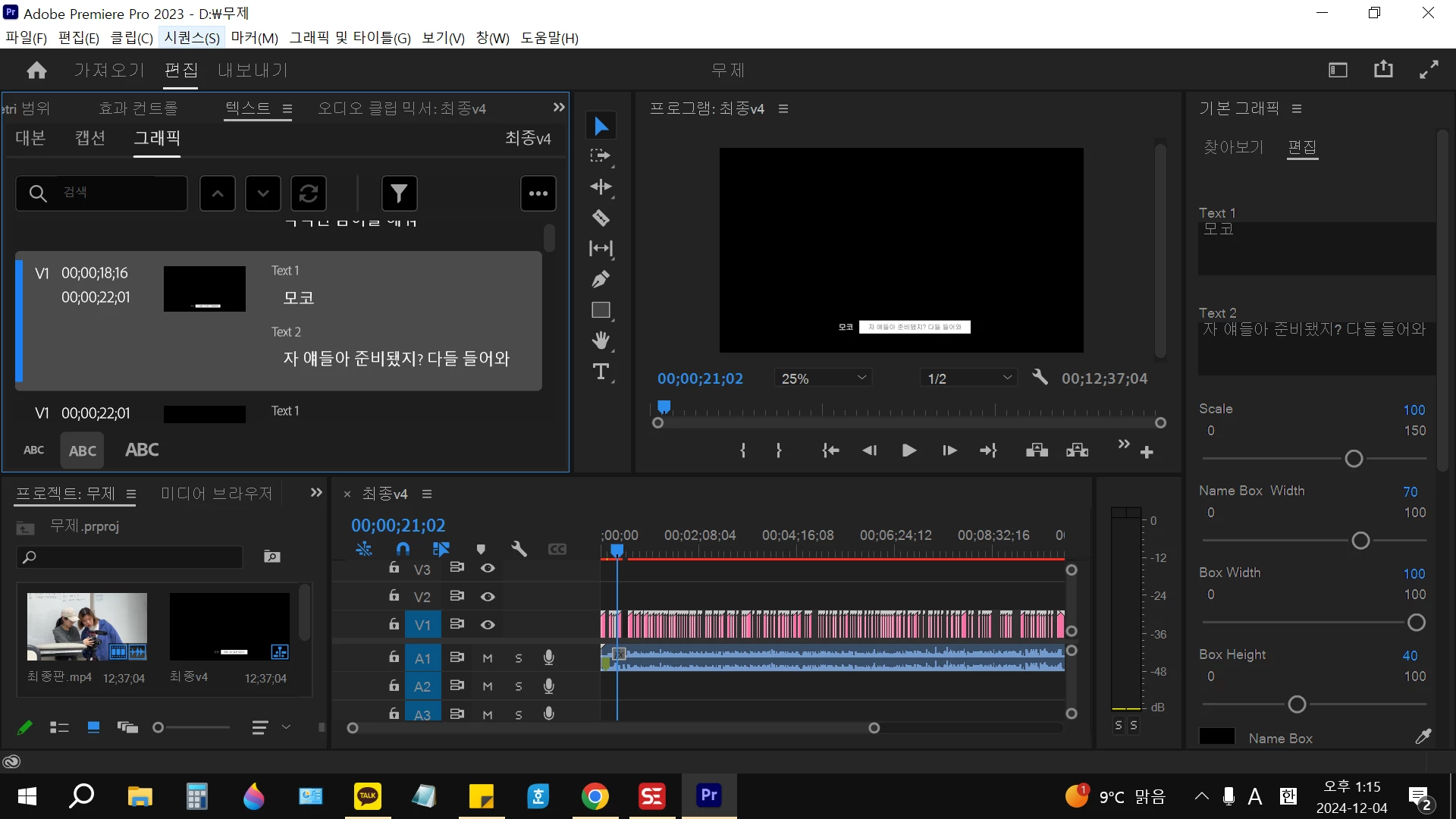 그래픽 자막을 v2로 옮기고, 영상 푸티지를 v1에 위치시켜보세요