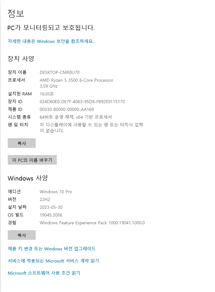pc 사양은 램 16기가, 그래픽 카드 지포스 gtx 1660 super, 라이젠 5 3500 으로