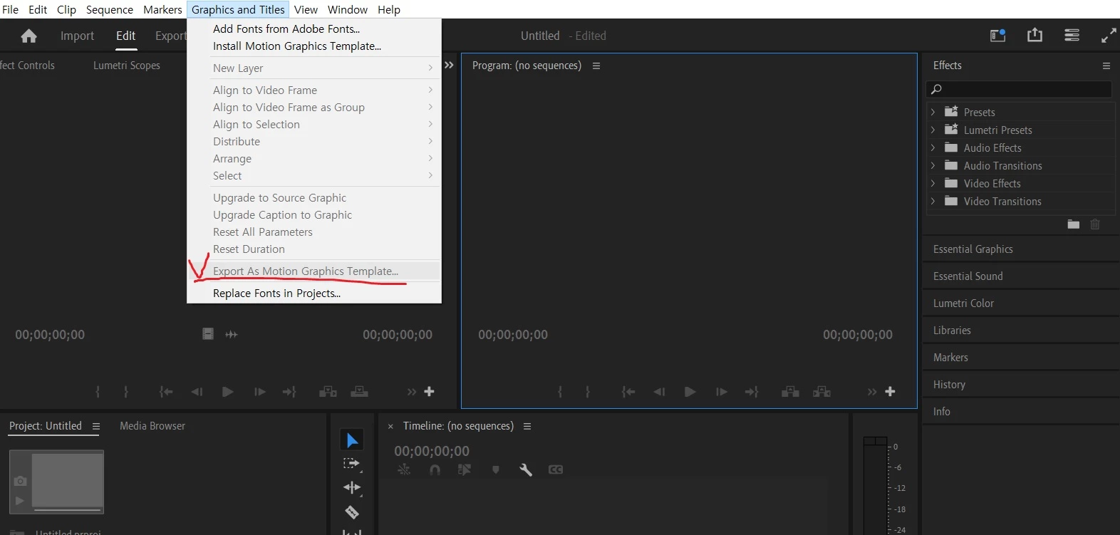 스크린샷에서 표시한 부분은 .mogrt 파일을 내보내는 Export로 확인됩니다.