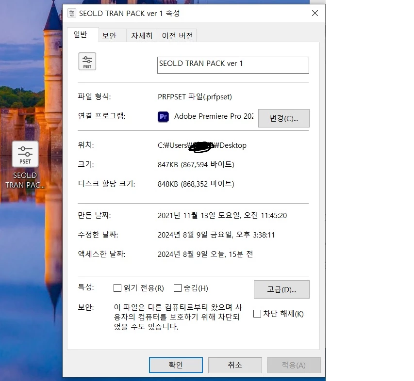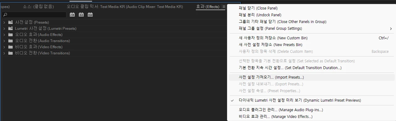 prfpset 파일은 효과 패널에서 위의 스크린 캡쳐본과 같이 사전설정 가져오기 선택하면 불러와 집니다.