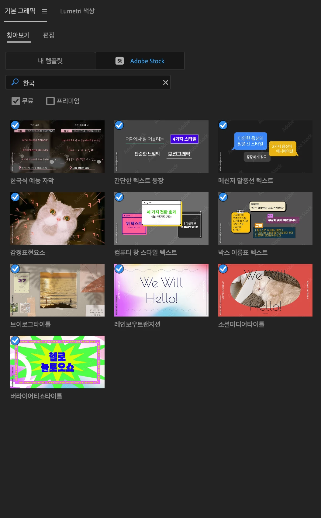 총 10개의 모션 그래픽으로 기본 그래픽 -> 어도비 스톡 -> 무료 -> '한국' 키워드 검색으로 확인이 가능합니다.