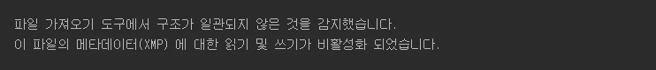 • 파일 읽기 기능이 (파일 이름) 파일 구조 불일치를 감지했습니다.이 파일의 메타 데이터 (XMP) 읽기 및 쓰기가 비활성화되었습니다.