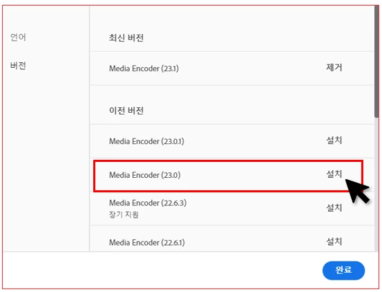 위 방법으로도 문제가 해결되지 않는 경우 Media Encoder 를 23.0 버전으로 다운그레이드 하여 사용해 주시기 바랍니다.