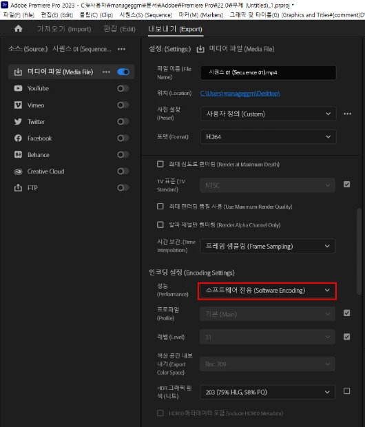 ▶ 내보내기(Export) > 비디오(Video) > ...기타(more) > 인코딩 설정(Encoding settings) > 소프트웨어 전용으로 변경(Software Encoding )