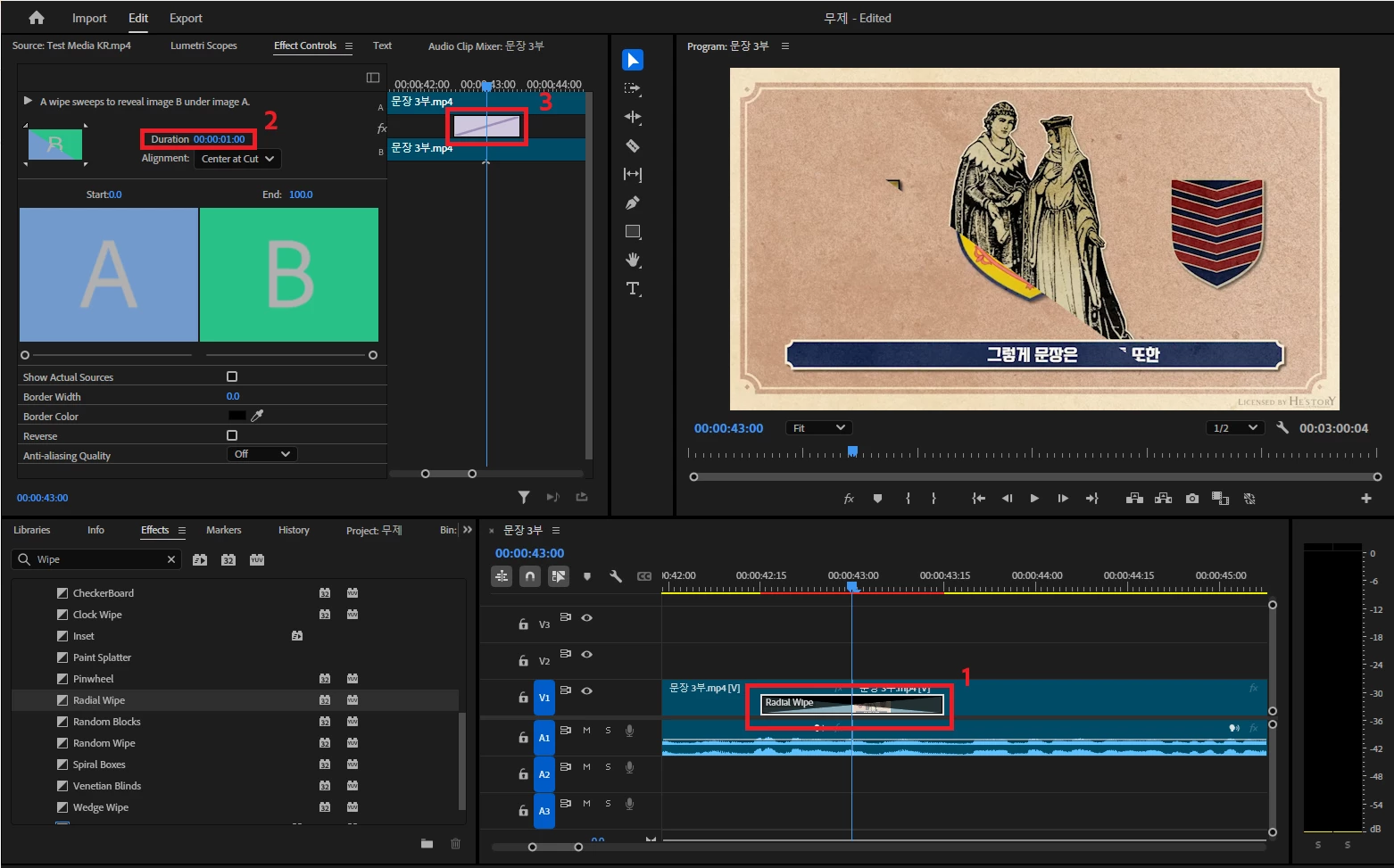 트렌지션 중 WIPE를 설정해서 진행하는 데, 같은 시작점, 끝점에 위치시킨 상황입니다.