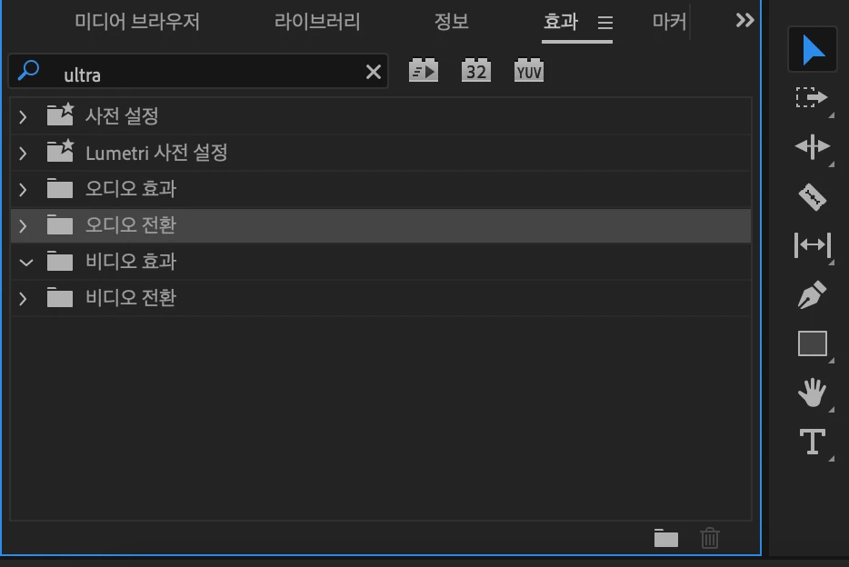 ultra 지워도 효과가 검색되지 않는다면, Premiere Pro 재설치를 해보세요.