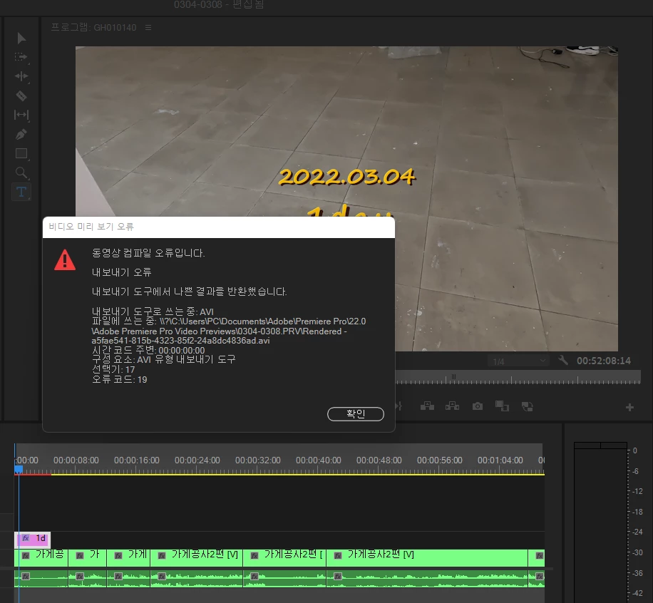 1. 새로운 프로젝트 문서를 생성하셔서 새로이 영상 및 시퀀스를 만들어주시고 테스트 해보시기 바랍니다.