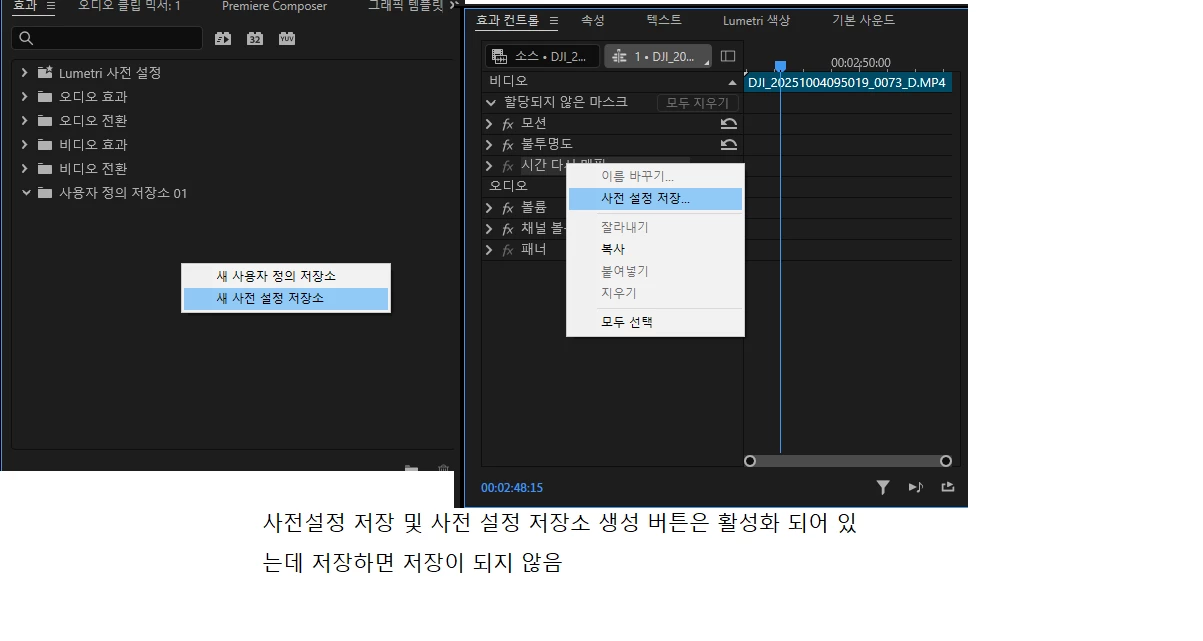 프리미어프로에서 효과 사전설정 저장이 되지 않습니다.