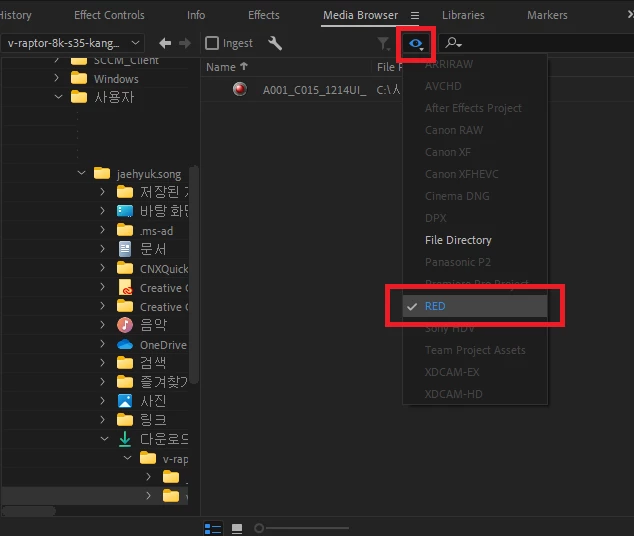 23년 버전까지는 미디어 브라우저로 red 카메라 촬영본 폴더를 r3d 파일로 인식해서 불러왔는데