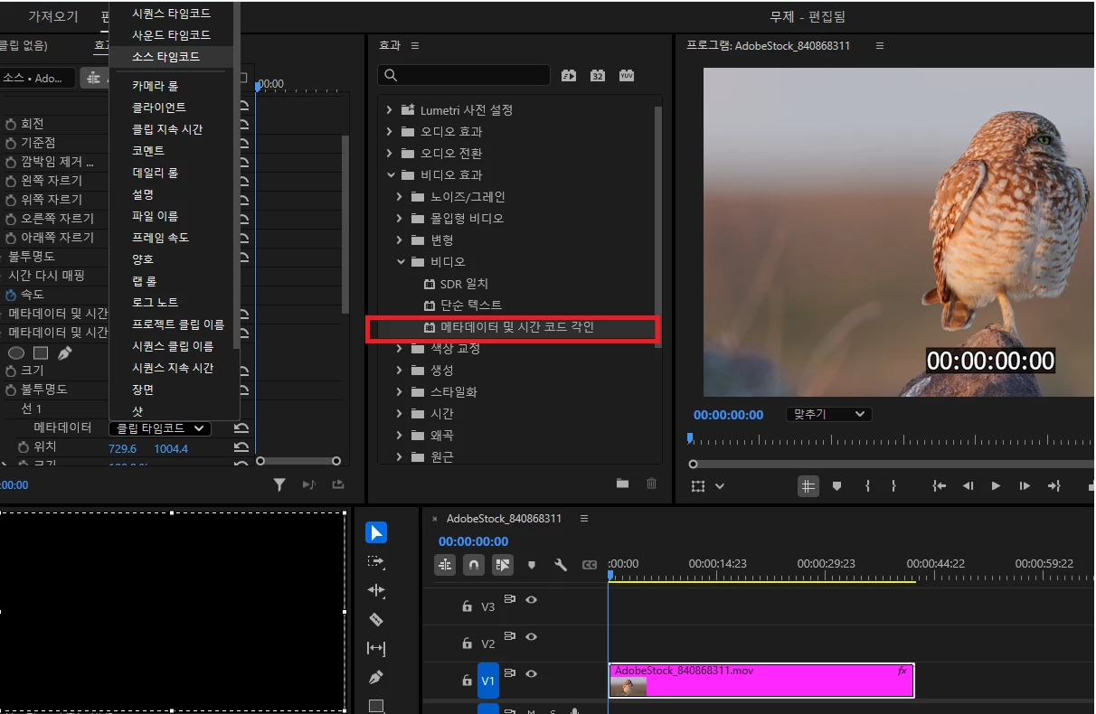 효과패널에서 Time code 검색이 되지 않습니다. Time code burn in 만 보입니다. 왜 그런걸까요?