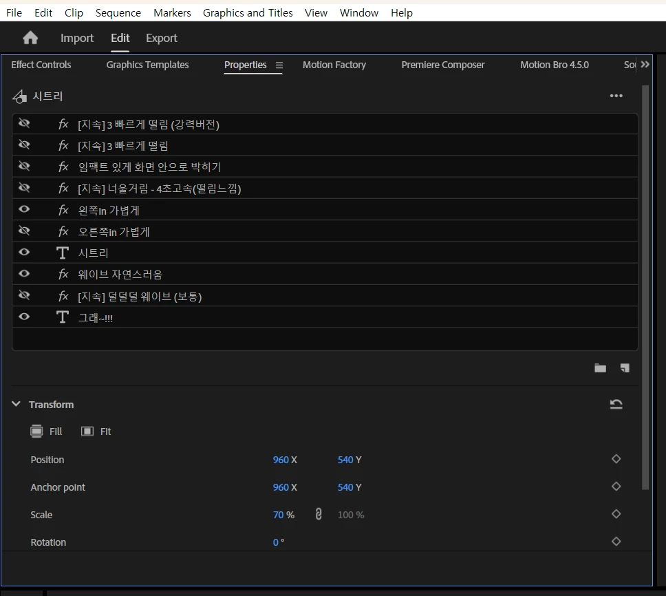 24버전까지는 효과 화살표를 닫으면 키프레임이 표시되지 않아 렉이 없었는데,