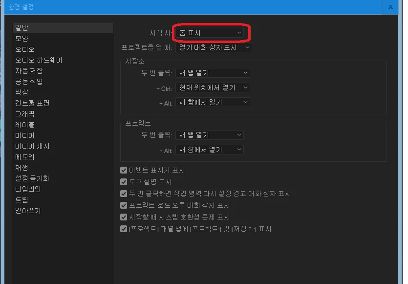 편집 > 환경설정 > 일반 > 시작시 > 홈표시