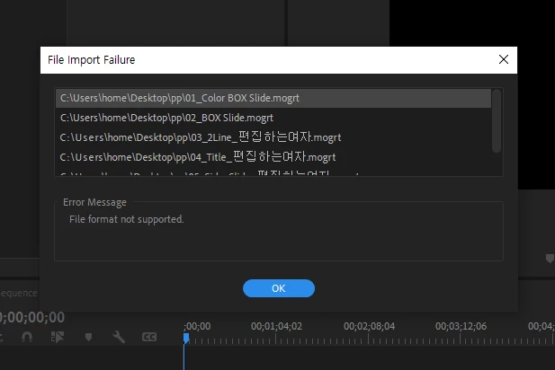 바탕화면에 자막관련 모션그래픽템플릿을 받아 프리미어프로를 구동하고 불러오려는데 그 템플릿파일이 보이지 않습니다. 도와주세요..