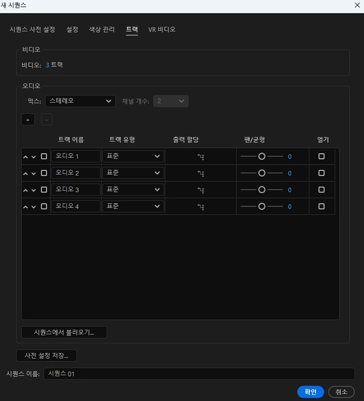 만약 촬영된 미디어의 속성이 나 녹화 셋팅등을 모르시겠다면 일단 새 시퀀스를 만들때 트랙 부분의 셋팅을 확인하고 모노 인지 스테레오인지 확인하고 모노,스테레오 둘다 셋팅을 변경해 보면서 테스트를 진행해 봅니다.