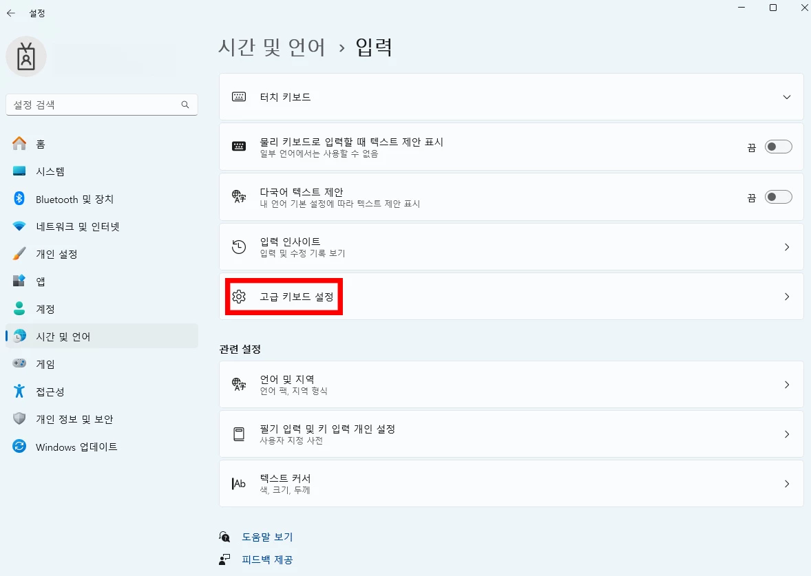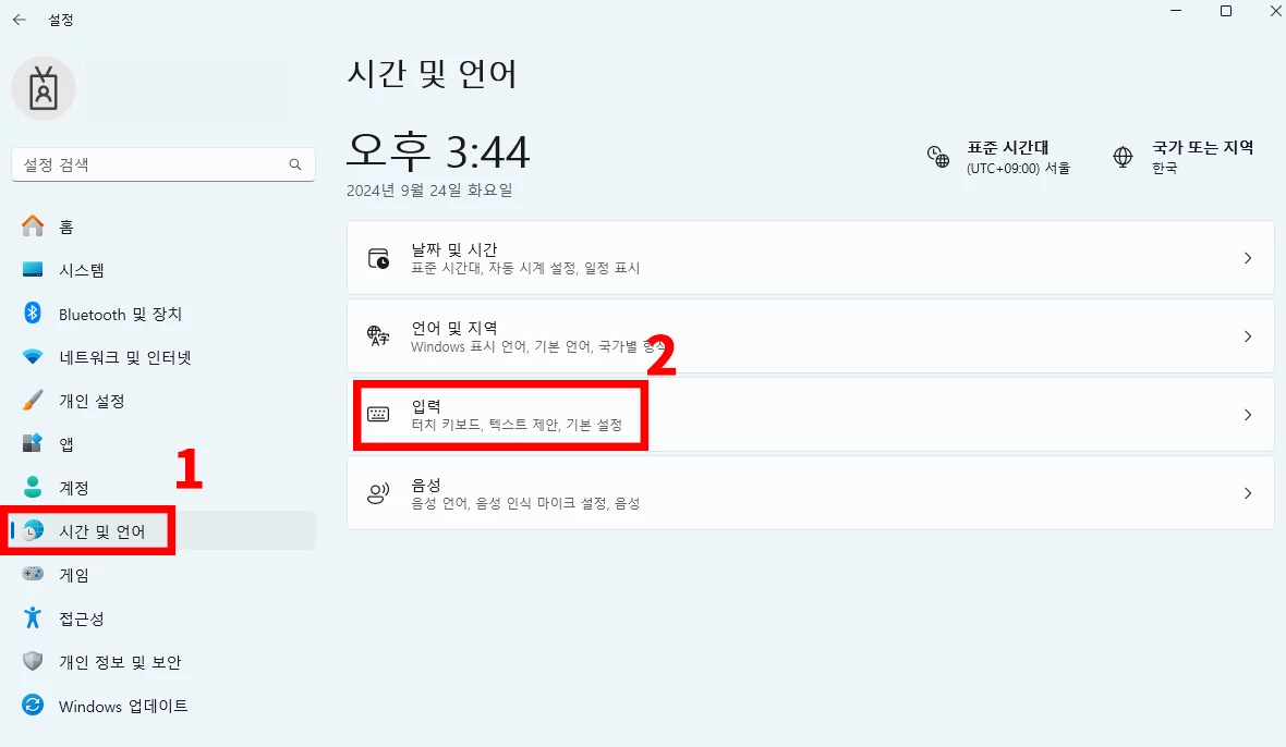 2. 좌측의 시간 및 언어 > 입력