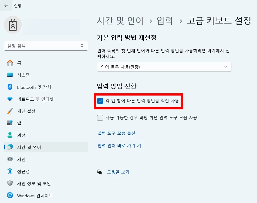 4. '각 앱창에 다른 입력 방법을 직접 사용' 옵션 체크