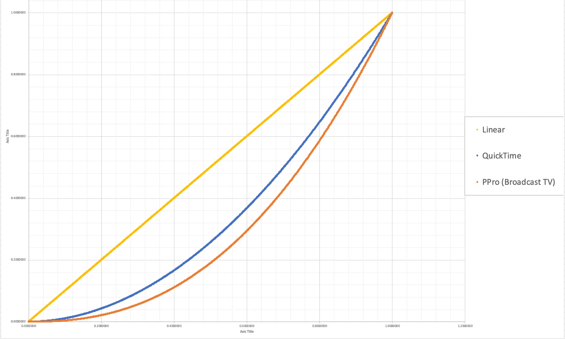 위의 그래프는 어두운 색상을 표시할 수 없는 QuickTime의 감마 표시 표준(파란색)과 비교하여 스펙트럼의 어두운 끝으로 떨어지는 Premiere Pro의 감마 표시 표준(주황색)을 시각적으로 표현한 것으로, 따라서 QuickTime은 채도가 낮은 비디오를 표시하여 색상이 빠져 보이는 느낌을 줍니다.