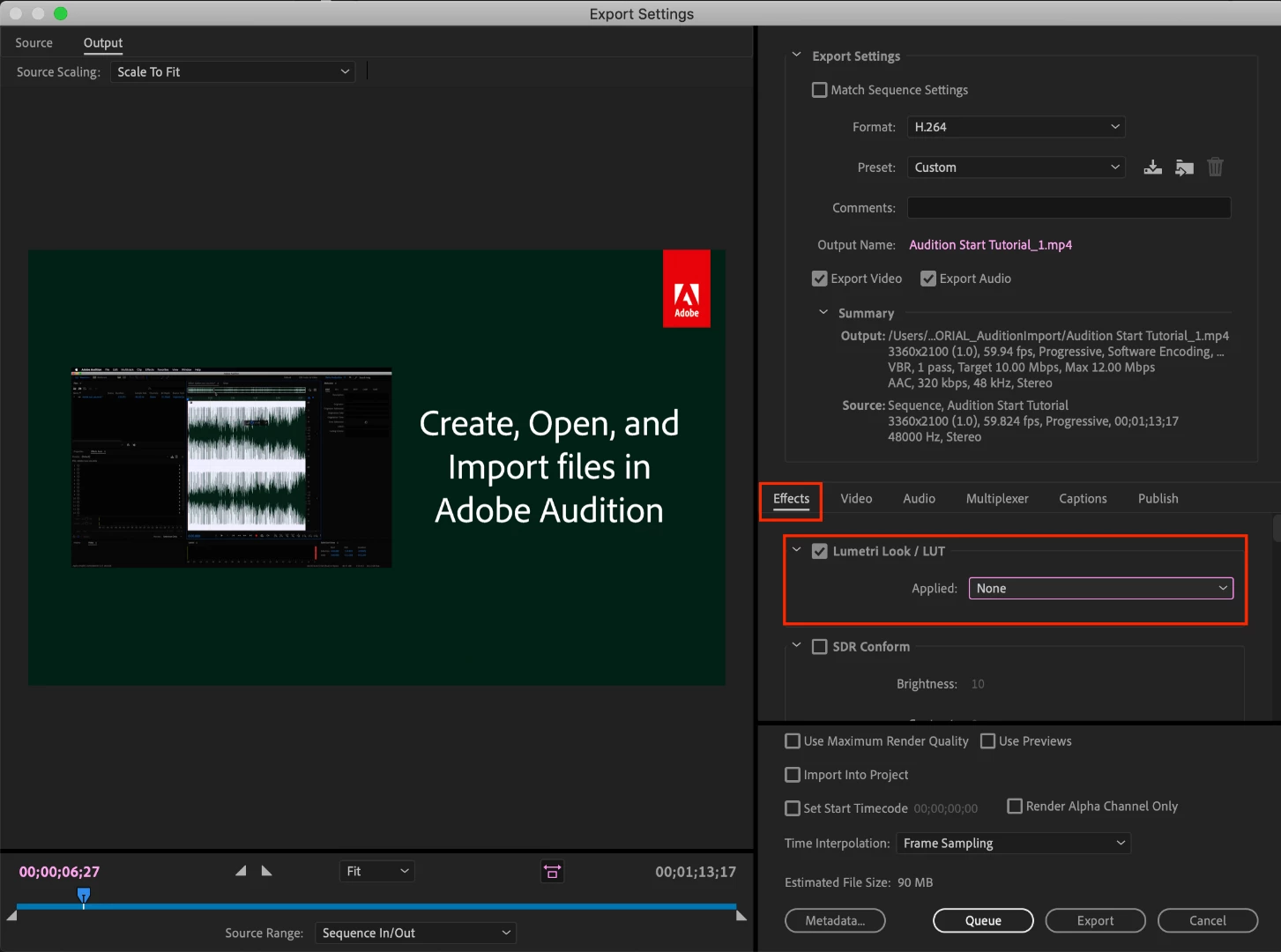 창의 중간쯤에 인코딩 설정을 조정할 수 있는 몇 가지 탭이 있습니다. "효과"라고 표시된 탭으로 이동하면 Lumitri Look/LUT 활성화 옵션이 표시됩니다. 해당 상자를 선택하고 드롭다운 메뉴를 연 다음 LUT를 저장한 경로에서 파일을 적용합니다.