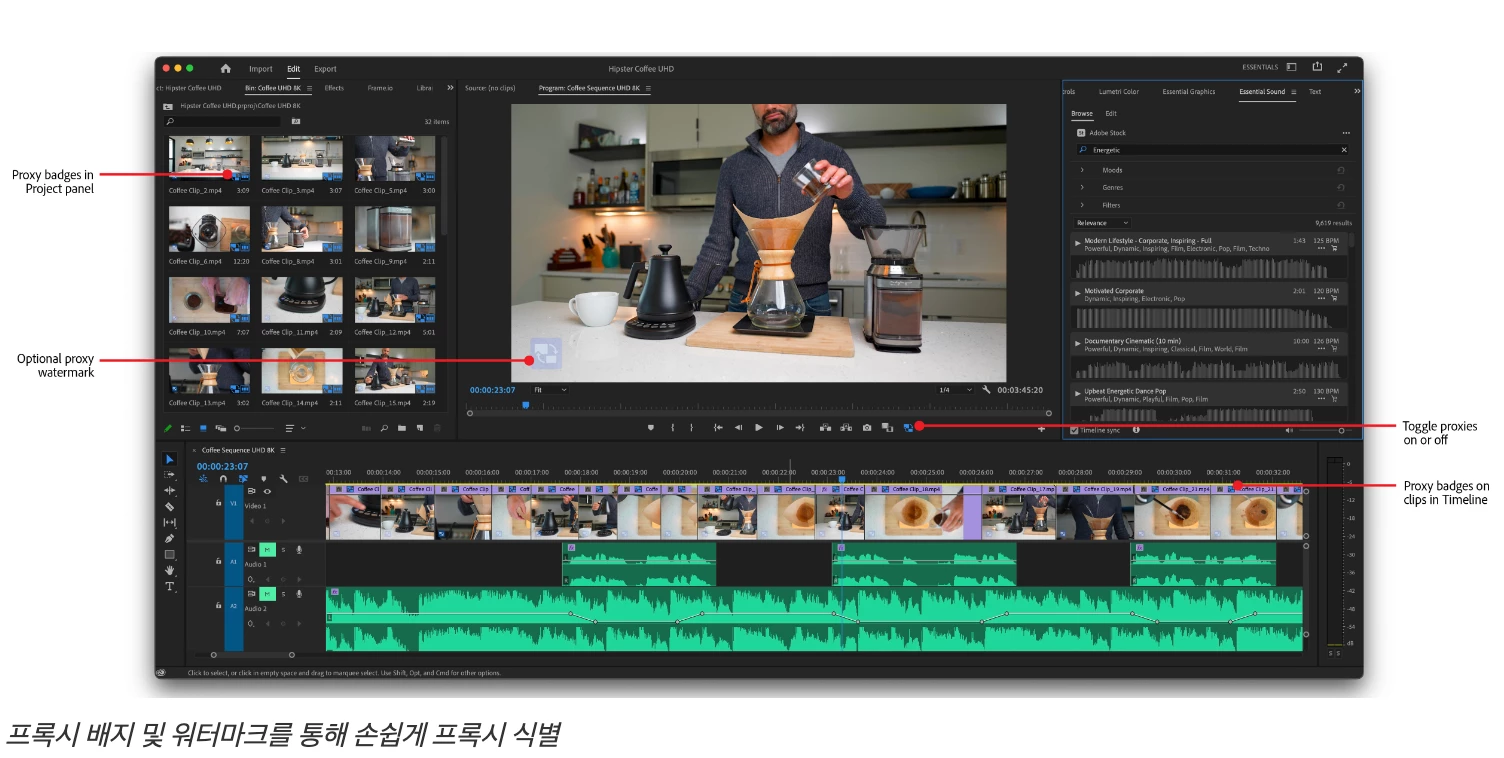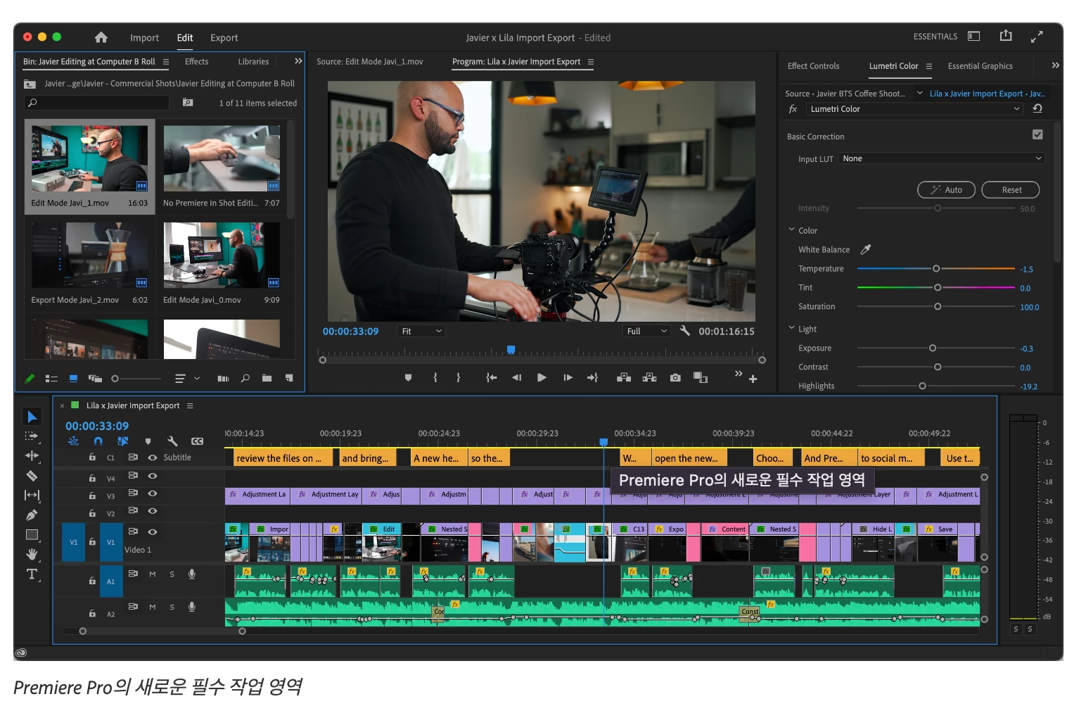 새로운 필수 작업 영역에서는 깨끗하고 간편한 레이아웃을 제공하고, 패널은 논리적으로 좌측에서 우측 워크플로우로 표시되며, 화면 하단에는 충분한 타임라인이 있습니다.