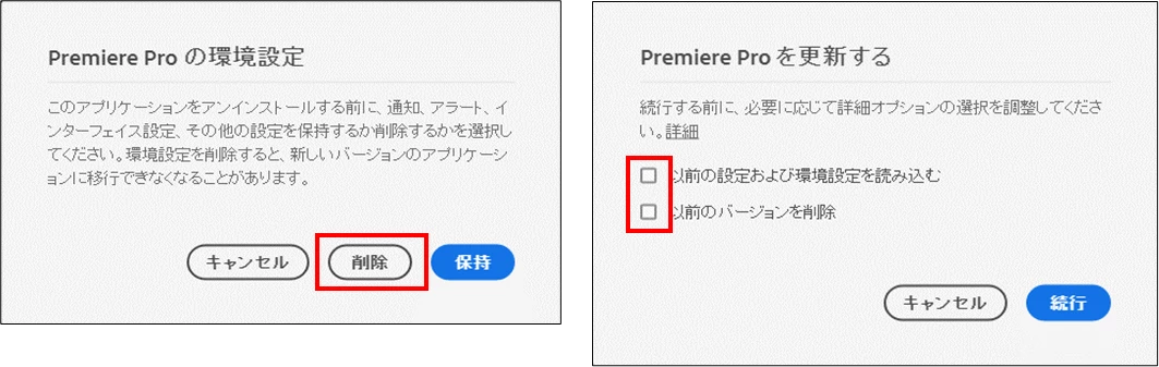 언인스톨 시, 「Premiere Pro의 환경설정」윈도우(아래 왼쪽 그림)가 표시되면, 「삭제」를 클릭합니다.재 인스톨 시 「Premiere Pro를 갱신한다」윈도우(아래 오른쪽 그림)가 표시되면 양쪽 모두 체크를 벗습니다.