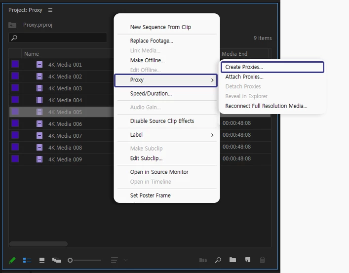 - 프로젝트 패널에서 프록시를 적용할 클립을 찾은 다음, 선택 후 우클릭합니다.