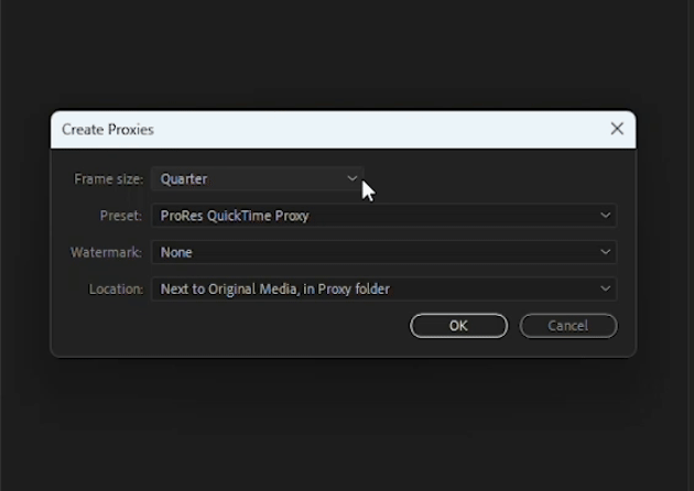 ❷ 프록시 미디어 크기와 사전 설정을 선택하세요.