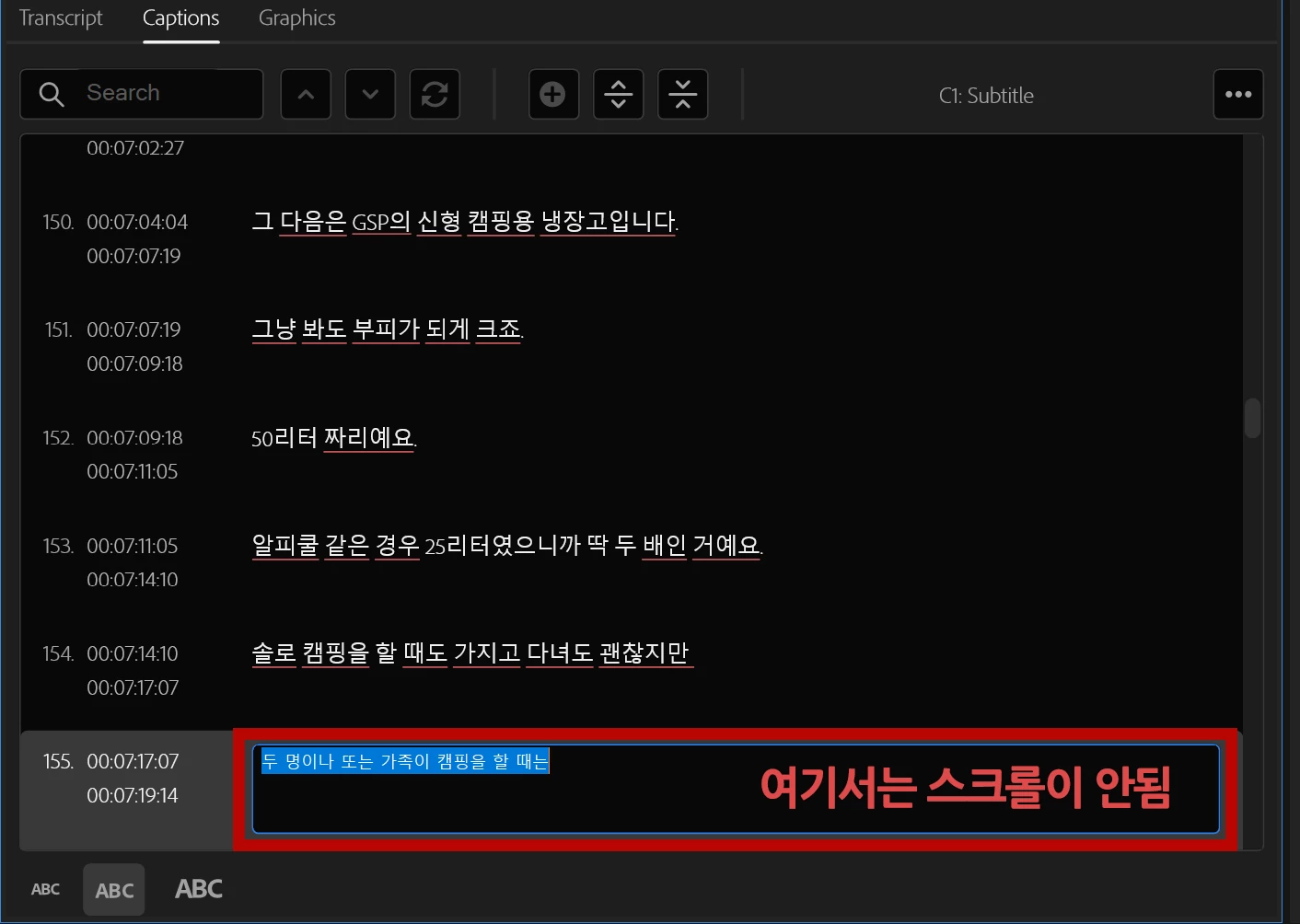 제일 밑에 있는 자막 박스에서만 스크롤이 안된다는 게 아니라