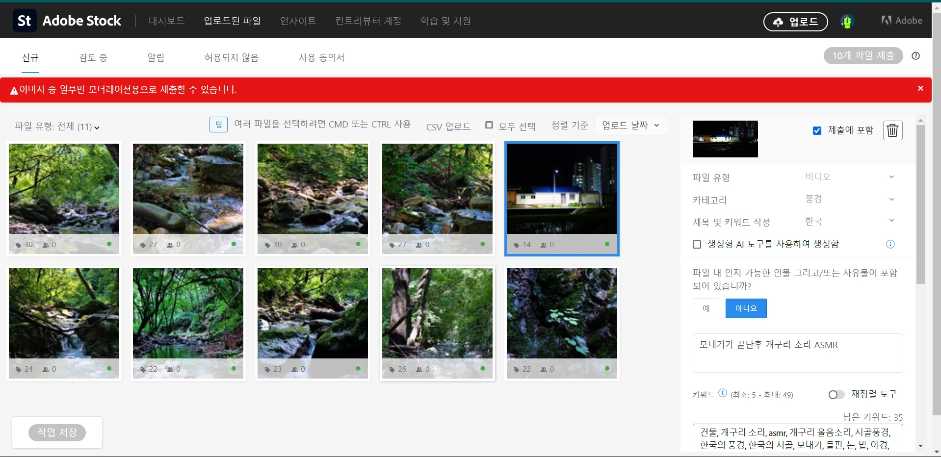 스톡에 동영상을 게시하고있습니다. 51개는 검토중이고, 추가로 더 제출하려하는데 위와같은 문구가 뜨면서 제출하기버튼이 활성화 되지않습니다. 무엇이 문제일까요? 해결방법도 알려주세요.