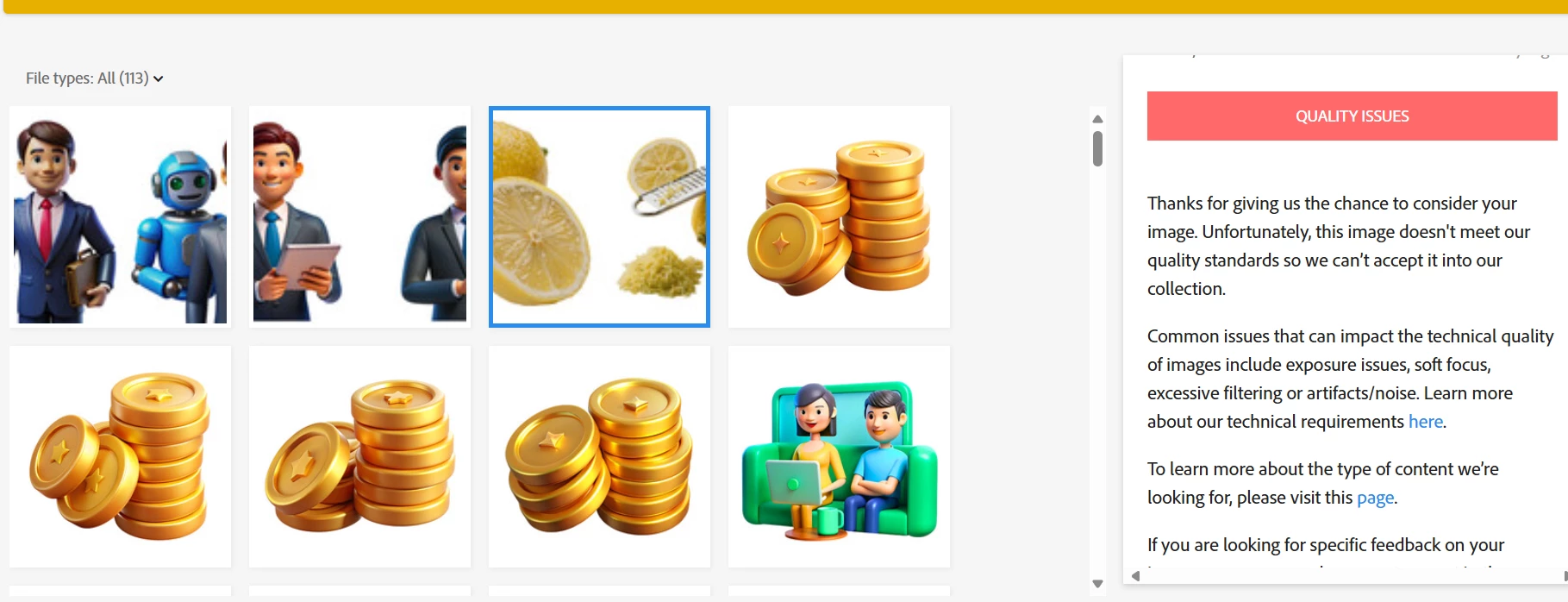 I have been uploading 3D illustrations in PNG format on Adobe Stock, but most of them are getting rejected. For example, if I upload 10 PNG images, around 8 get rejected, while the same AI-generated images in JPG format get accepted without any issues.
