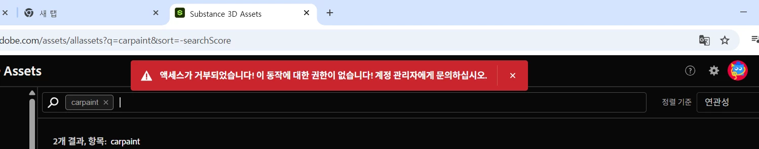공동구매한 Adobe Creative Cloud 1년 플랜을 사용 중인데 Substance painter 프로그램에서 제공하는 asset을 다운로드하면 액세스 거부 메시지가 뜹니다. 어떤 플랜으로 구독해야 asset을 이용할 수 있나요?