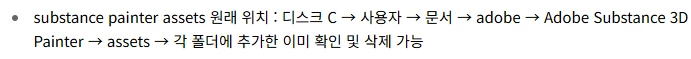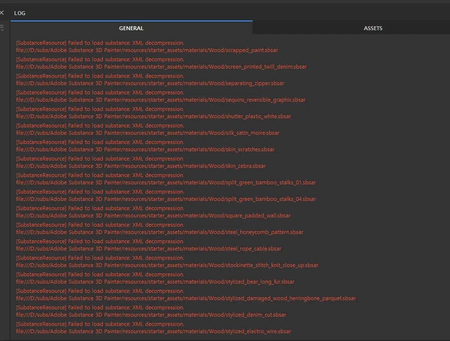 336545787nkv3ParticipantForum|Forum|10 months agoApril 3, 2025Question바로 아래 질문자입니다 ㅜㅜForum|Forum|10 months agoApril 3, 20251 reply452 views말씀해주신 경로 (C:\사용자\사용자이름\문서\Adobe\Adobe Substance 3D Painter)에서도 에셋파일은 안 보입니다.ㅜㅜ 제가 기존 섭스를 지우면서 컴퓨터내에 있던 섭스관련 파일은 전부 삭제했었는데 그게 문제였을까요.. 새로 설치한 섭스를 실행해보면 로그창에 저런 문구가 뜹니다. 새로 다운받은 섭스 파일에서 starter_assets파일이 있어 이곳에라도 넣어봤는데 역시나 반응이 없습니다.