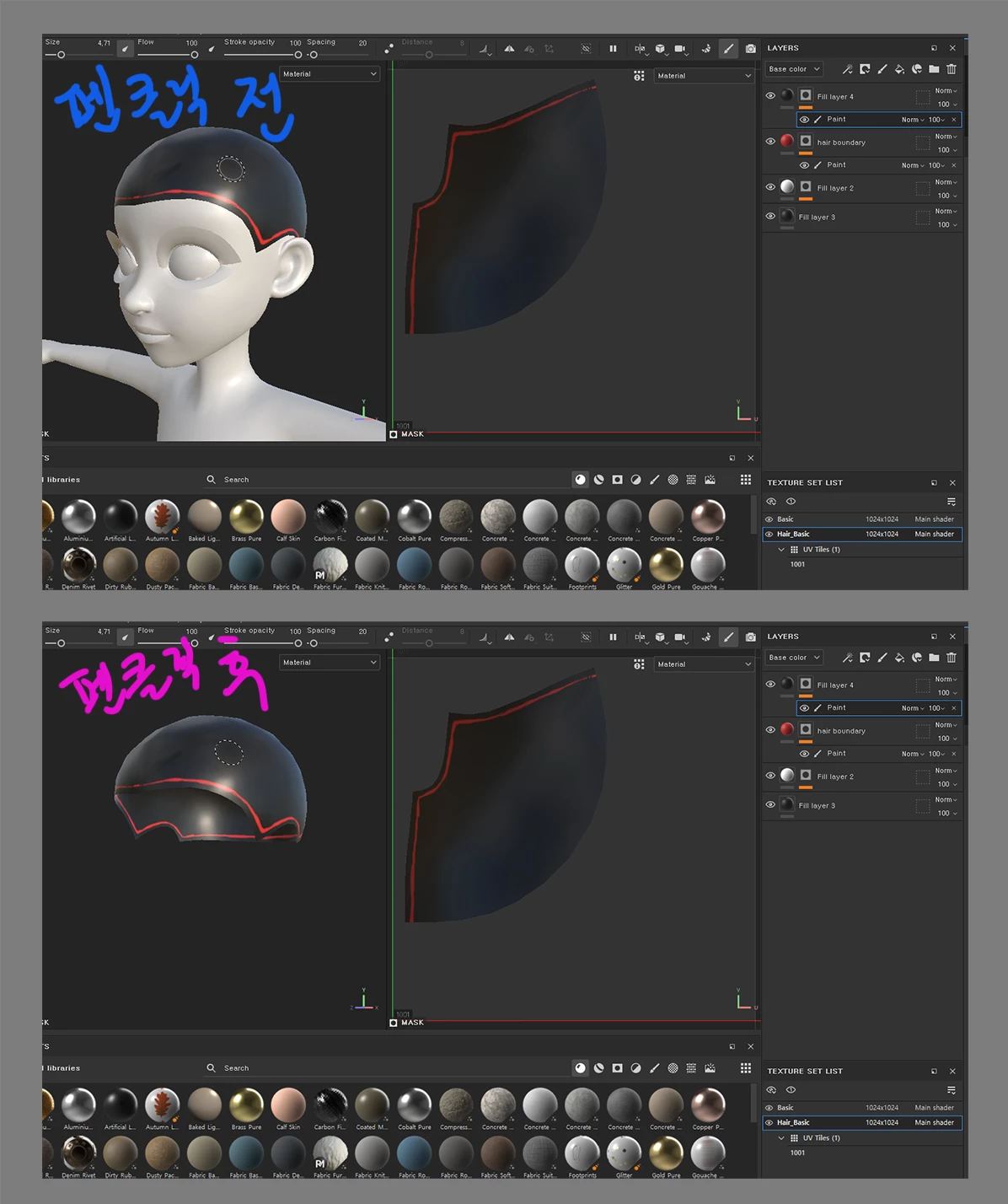 돌돌30039835osufParticipantForum|Forum|2 years agoMay 24, 2023質問서브스텐스] 펜을 클릭 중에는 "텍스쳐 셋 리스트"에서 선택한 메쉬를 제외한 다른 메쉬가 뷰포트상에서 사라져요.Forum|Forum|2 years agoMay 24, 2023返信数 0.536 ビュー안녕하세요,.서브스텐스 3D 페인터 2022(스팀 구매)를 사용중입니다.이런적은 처음인거 같은데 뷰포트상에서 테블렛 펜을 테블릿에 클릭 중에는 "Texture Set List"에서 브러쉬질 하기 위해 선택 중인 메쉬를 제외한 다른 메쉬가 뷰포트상에서 사라져요. 다시 테블렛 팬을 테블릿에서 떼면 다시 사라졌던 다른 메쉬가 나타닙니다. 뭔일 일까요?어떻게 바로 잡을 수 있을까요?버그일반 문제 해결사용방법
