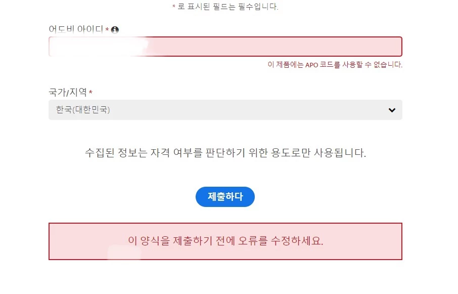 안녕하세요, 어느 사이트에서 해당 오류를 겪고 계신지 링크를 댓글로 달아주시겠어요? Adobe ID 이메일 주소도 함께 알려 주시면 관련 팀으로 문의해보겠습니다.