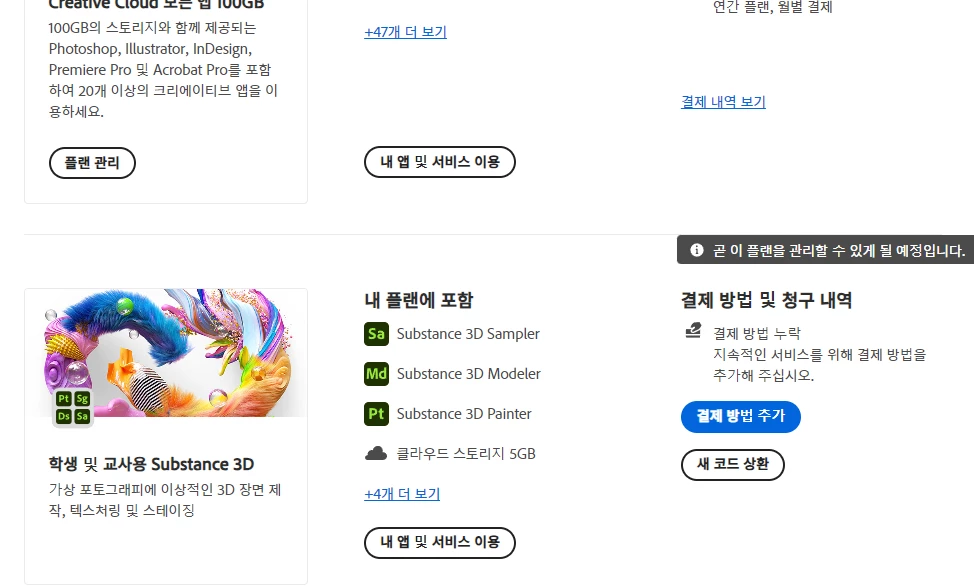 이미 creative cloud 모든 앱 100g 플랜을 쓰고 있습니다.