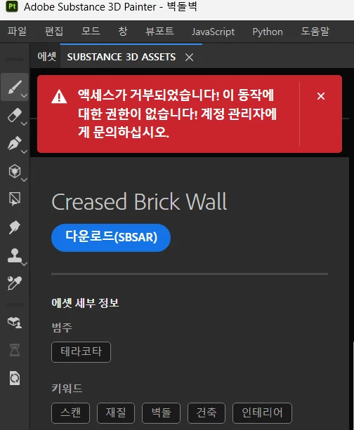 위 사진처럼 에셋을 다운받으려는데 거부가 됩니다 어떻게 해결해야하나요?