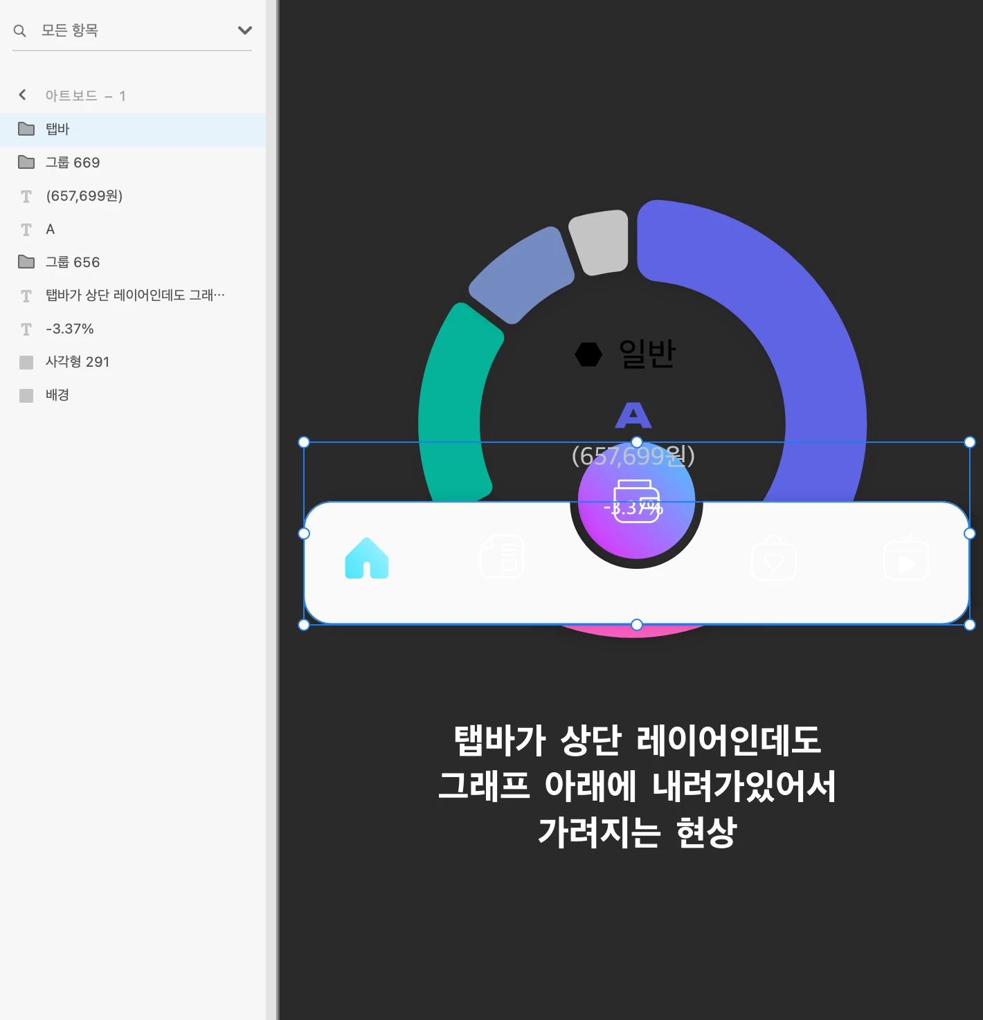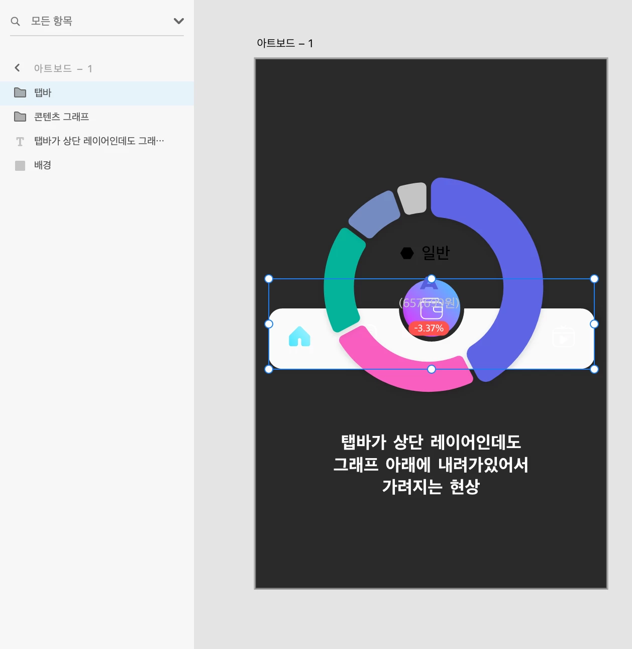 작업할 때 그룹지은 레이어A(탭바) '맨 앞으로 가져오기' 해도 다른 그룹지은 레이어B(그래프)에 가려집니다. 레이어 순서를 봐도 A가 상단레이어거든요.
