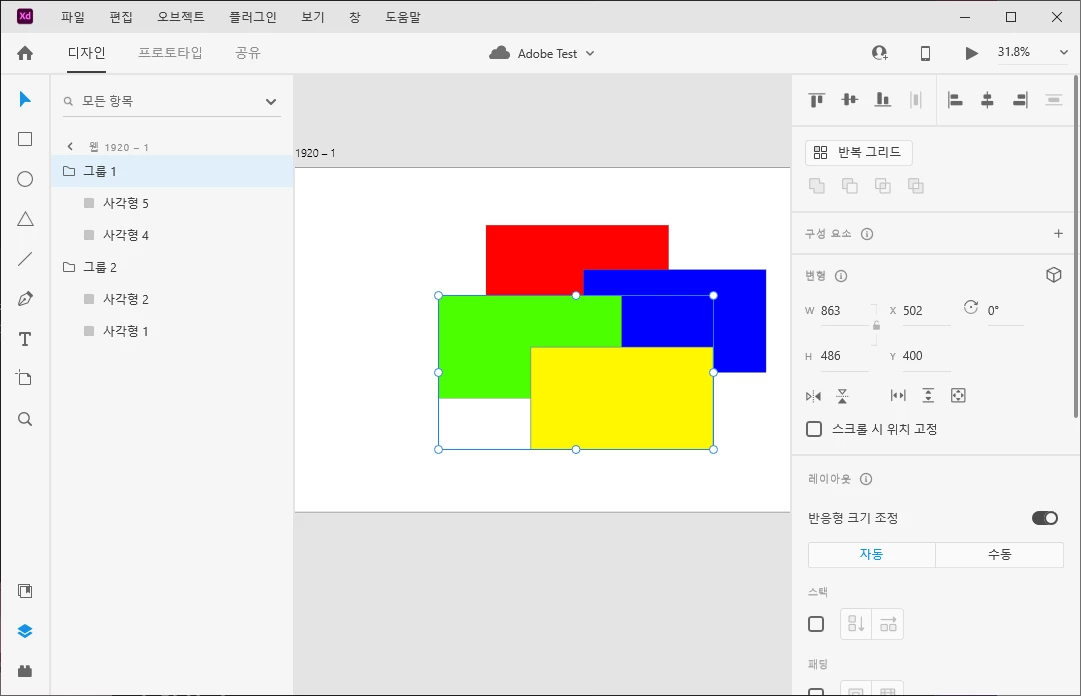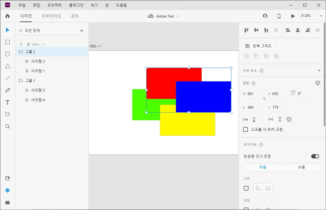 해당 증상 확인을 위해 XD 파일에서 아래와 같이 도형을 생성 후 그룹을 지어 레이어 순서 위치를 변경했을 때 정상적으로 위치가 변경되는 것을 확인하여 고객님게서 남겨주신 오류에 대해 특정 레이어(작업물)에서만 발생되는 오류로 보여집니다.
