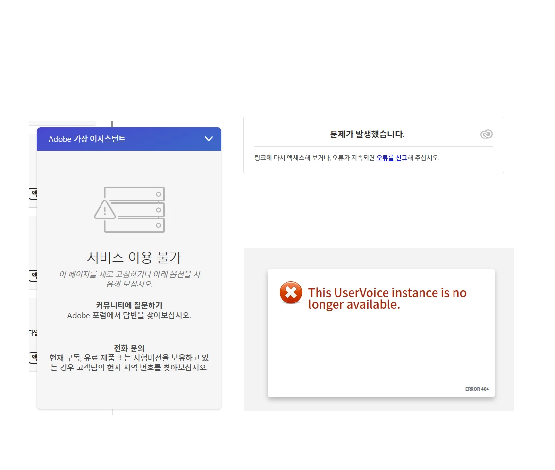 어제 경 Adobe에서 제공되는 서비스 서버에 일시적으로 연결 오류가 발생했습니다.