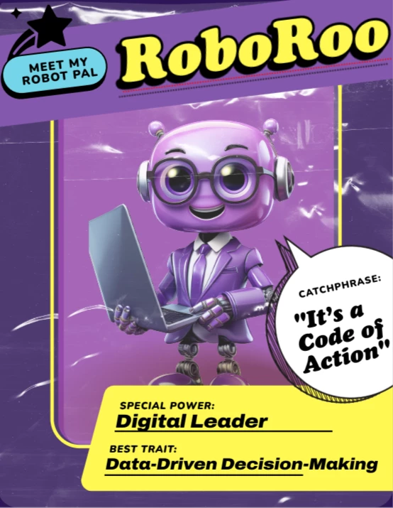 Meet RoboRoo — 💡 Special Power: Digital Leader 📊 Best Trait: Data-Driven Decision-Making 💬 Catchphrase: “It’s a Code of Action!”