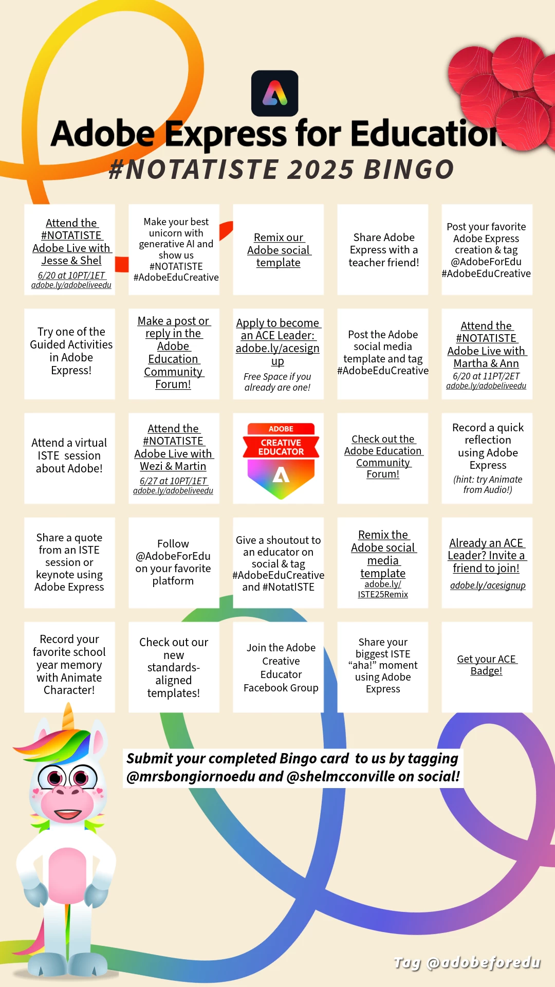 Our ISTE 2025 Bingo Board is full of fun, fast, and fabulous ways to get engaged. Attend sessions, post your creations, take selfies with unicorns (yes, really)—and win prizes while doing it.