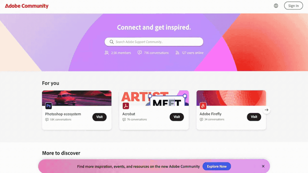 The Adobe Community is more than just product forums—it’s a place to connect, get inspired, and grow as a creator. Our new Community homepage brings it all together in one central place, giving you a clearer view of everything available to you. Whether you’re here to learn, contribute, or just explore, this community is for you — a place where ideas grow, connections form, and your voice helps shape the future of our products. This is your Community.